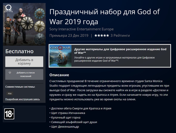 До 6 января (11:00 МСК) в PlayStation Store можно бесплатно скачать «Праздничный набор» для God of War. Загрузить с PlayStation. Информация для тех кто не знает "God of War" продается в "ДНС" и "Эльдорадо" по цене в 1 тысячу русских рублей.